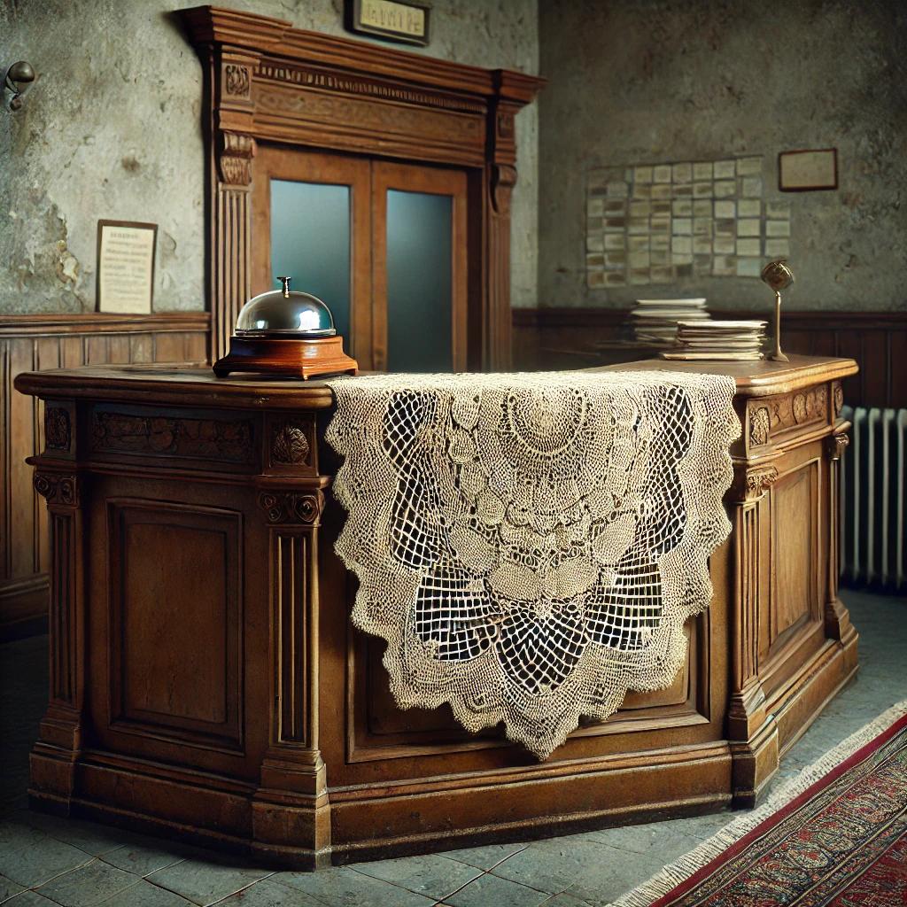 Entramos. El recibidor desprendía un olor difícil de describir, una mezcla de humedad, madera vieja y algo que podría ser comida rancia. La recepción estaba atendida por una anciana que parecía no haber visto un rayo de sol en años y que se movía con la parsimonia de quién no tiene apuro alguno en la vida, vestida con un mandilón de cocinar o limpiar que parecía no haber tocado el agua desde el día que se compró. Sobre el mostrador un viejo mantelo de crochet servía más como decoración que como elemento funcional. Pero bueno, al final, era parte de la experiencia, ¿no?